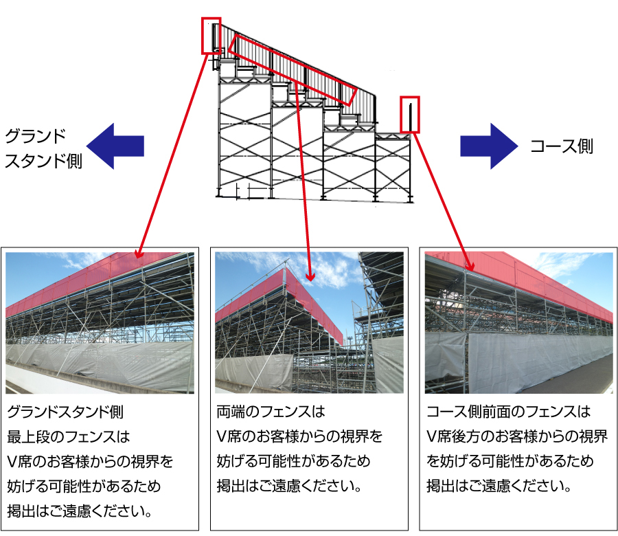 Regarding the display of banners at the Victory Stand, please refrain from placing them in the following locations to avoid obstructing the view of other guests.